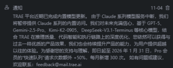 11月4日,多位用户反映收到字节跳动旗下AI编程工具Trae国际版的邮件通知:因服务调整,平台将不再提供Claude模型的访问权限。